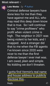As evidenced by the following screenshots, Luke Wenke has doxxed, threatened to doxx, and threatened to leak and/or misuse sensitive personal information about his victims with the apparent intention of causing unwanted contact and other problems for those individuals.