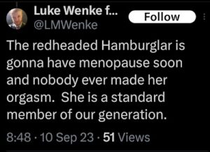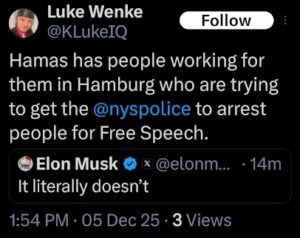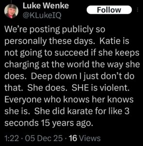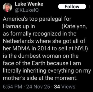 Note: In his recent Tweets, Luke Wenke used “Hamas” as a code word for myself (Katie) and two other victims (the Minnesota attorney and his romantic obsession, Ryan)