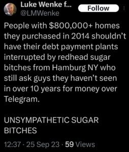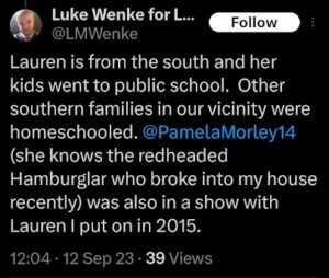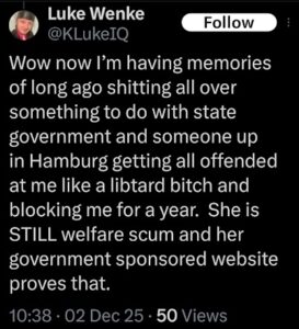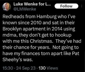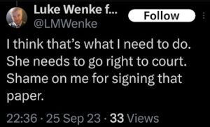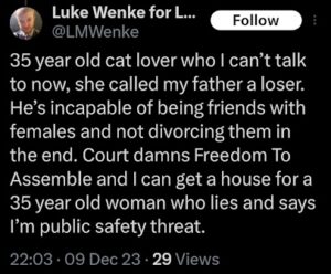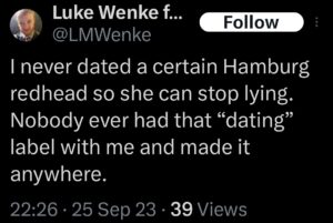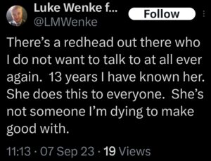 The next post is particularly disturbing because it’s about my ex-husband, whom I’ve been divorced from since 2012 (yes, 14 years ago). There’s no bad blood between us, as far as I know, because we haven’t spoken in well over a decade. The fact that Luke Wenke thinks about my past partners more often than I do reflects the troubling extent of his irrational obsession with me.