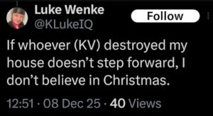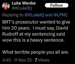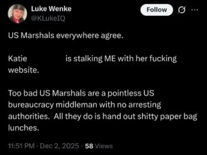 NOTE: In the weeks leading up to his most recent arrest on 12/17/2025, Luke Wenke used “Hamas” as a code word for several of his victims including myself, Ryan (his romantic obsession), and the Minnesota attorney he served prison time for cyberstalking.