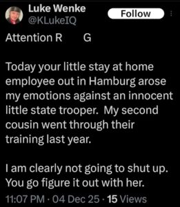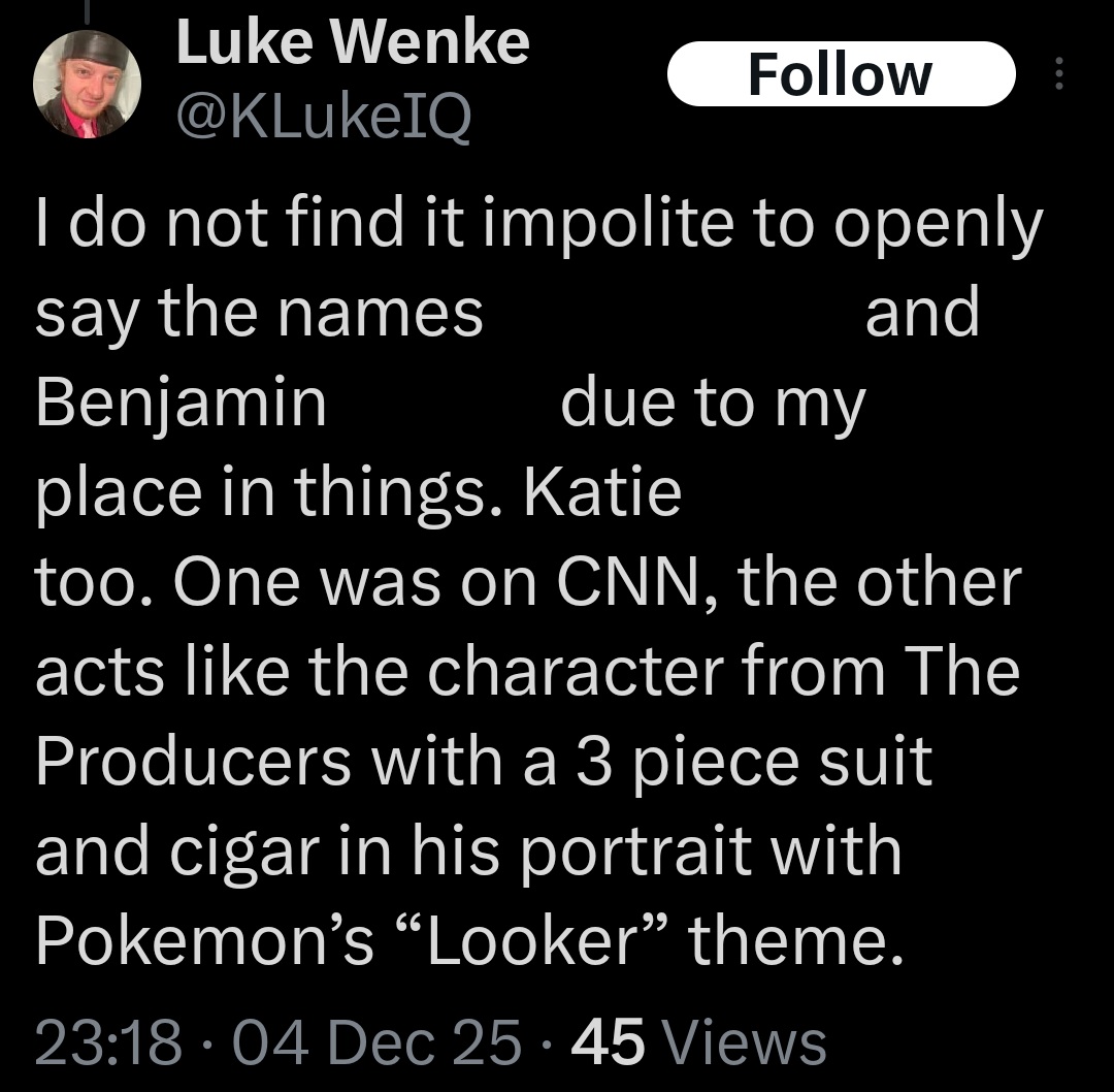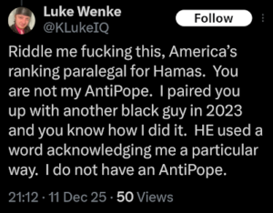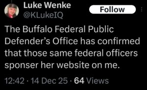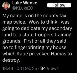 NOTE: In the weeks leading up to his most recent arrest on 12/17/2025, Luke Wenke used “Hamas” as a code word for several of his victims including myself, Ryan (his romantic obsession), and the Minnesota attorney he served prison time for cyberstalking. I believe that Wenke’s use of the term “Israeli Army” is a reference to a theoretical paid assassin (i.e. a hitman).