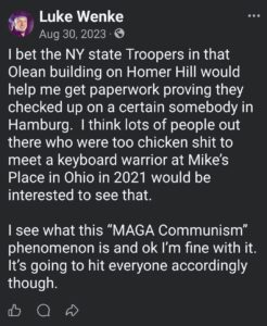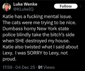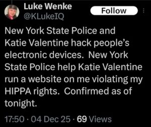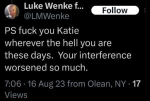 Categories: Luke Wenke, False Allegations: burglary/home invasion, conspiracy/collusion, drug crimes, drug use, hacking, HIPAA violations, trespassing, vandalism/property damage; Obsessions: Carl Paladino obsession, Katie Obsession, Ryan/Benjamin obsession; screenshots, social media posts, Threats: death threats, doxxing, lying to police, misuse of personal information, physical harm, threats to sue