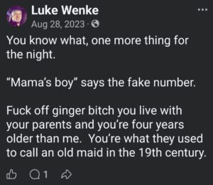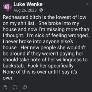 The following screenshot reflects Luke Wenke’s apparent belief that his victims should suffer in silence and that he deserves carte blanche when it comes to his internet behavior. For context, Wenke’s mother had recently gained access to my Instagram account, where I had mentioned being stalked. In addition to trying to control my speech on a PRIVATE social media account while routinely slandering me in VERY public posts, Wenke falsely accused me of destroying one ex-boyfriend’s marriage and ruining another’s life.