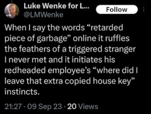 Luke Wenke has been harassing and stalking me since I ended our friendship nearly four years ago. For a long time, I ignored him and stayed silent, hoping he’d eventually leave me alone. But that never happened — in fact, as the following screenshots demonstrate, Luke Wenke’s obsession with me has only intensified, and his stalking behavior has only escalated, over time.