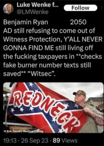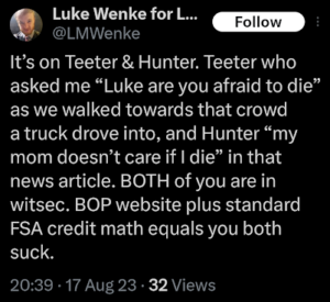 luke wenke x twitter screenshot benjamin ryan teeter obsession death threat 2023