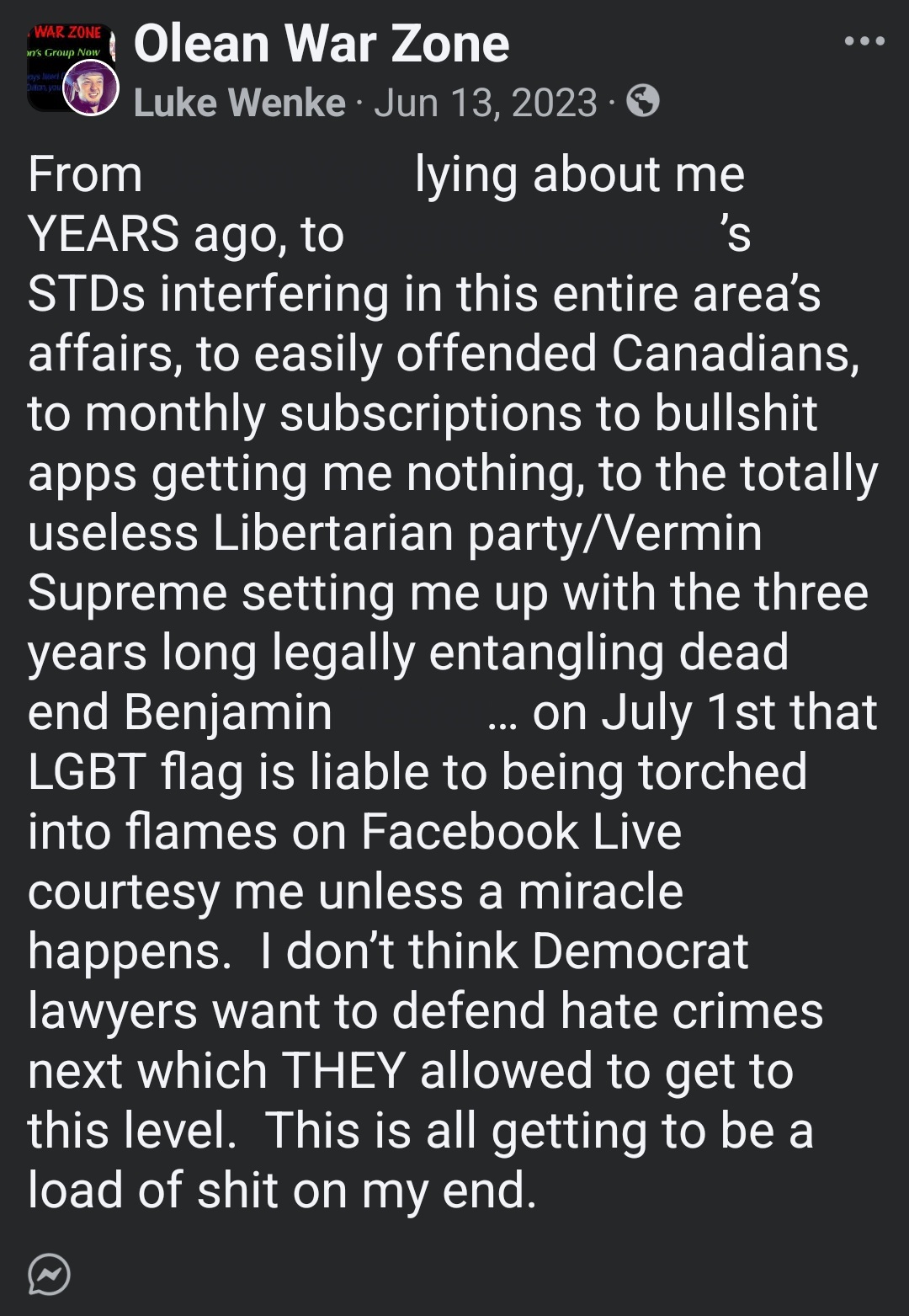 luke wenke facebook screenshot threats ryan obsession 2023