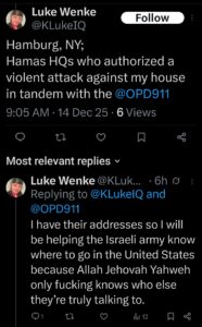 On December 14th, 2025 — three days before his most recent arrest for cyberstalking a federal judge — Luke Wenke made the following Tweets/social media posts over a period spanning less than 24 hours. In my opinion, anyone who reads the following material and still thinks of him as harmless is living in a fucking fantasy world. I don’t see much room for confusion here, but the state police never followed up on my request for an investigation and the feds have made it clear that they want nothing to do with it.